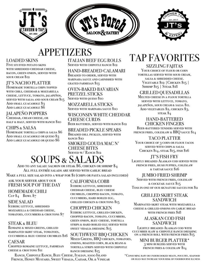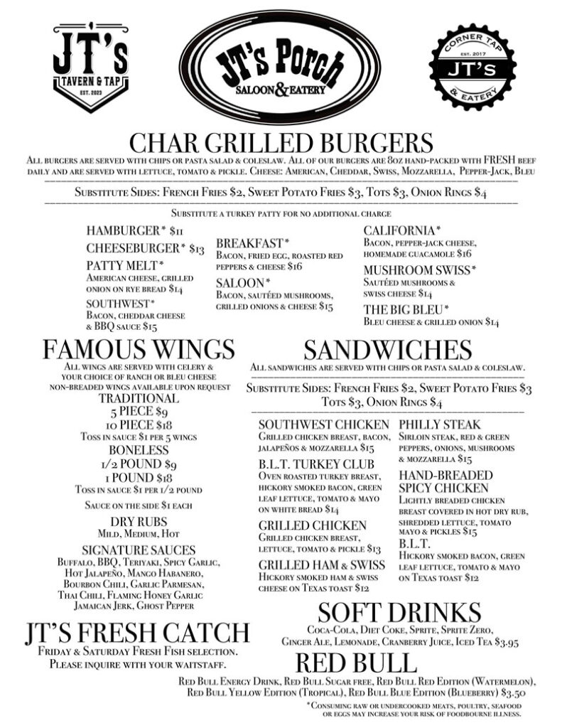 At JT’s Porch we pride ourselves in having the best wings around! Our wings are bigger and better than all the competition. Whether you like Mild or Extra hit we have a style and sauce for you!